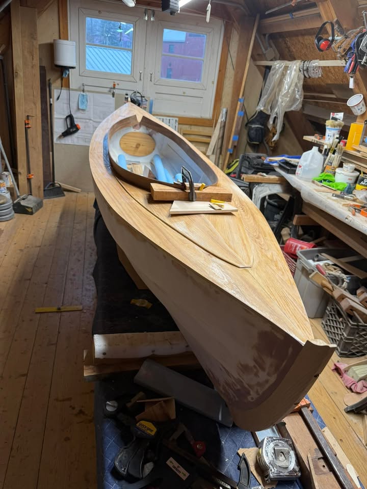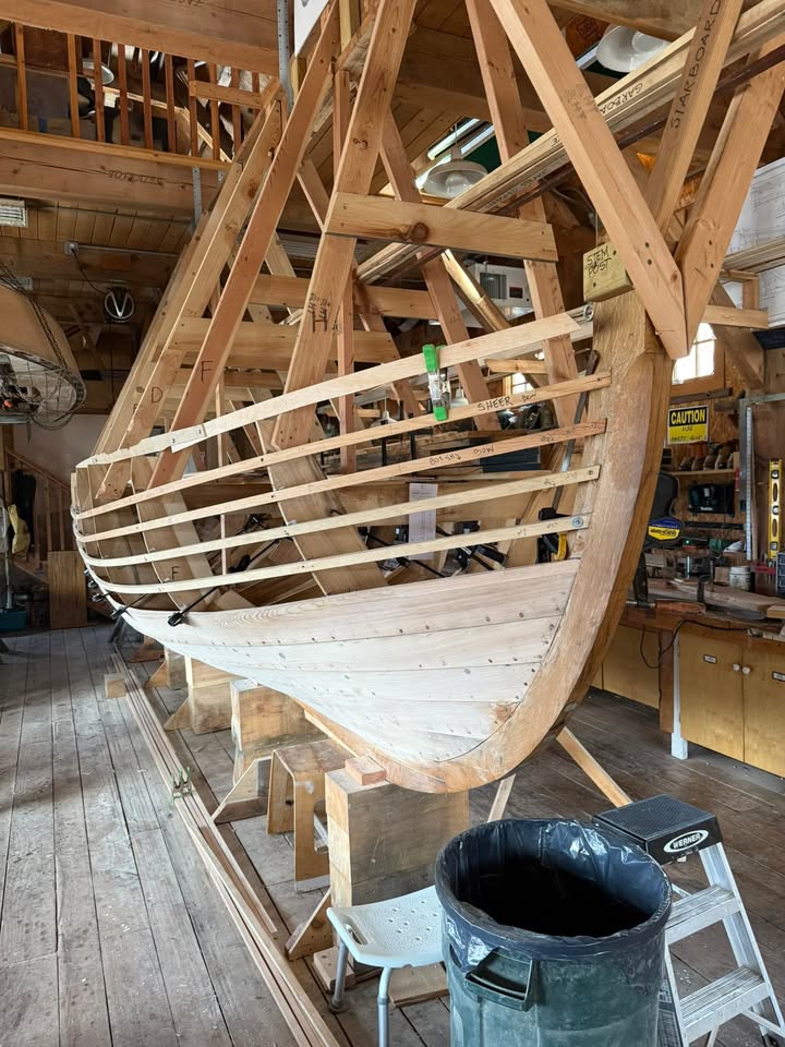 The 2025 Raffle Boat is coming along. It’s a 10.5 ft Double Paddle Fiddlehead decked canoe. The original design dates back to 1885, Rushton’s Wee Lassie, it’s strong and lightweight, it was used for canoe camping in the Adirondaks. This Fiddlehead version was designed by Harry Bryan in the 80’s. It’s planked with Eastern White Cedar cutoffs from the Whaleboat 1776 project, and has a beutiful mahogany combing. Hull will be finished with George Kirby No.33 Dark Blue topside paint, deck and combing will receive many, many, many coats of Captains spar varnish. Kirby paints has been in business in New Bedford for over 175 years. Raffle Tickets will be available at Harborfront Park and the Boat Shop, once the Sunday Farmers Market kicks off. (fb)