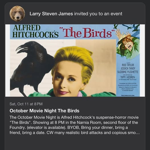 Sat, Oct 11 at 8 PM October Movie Night The Birds Location: @thefoundrylnk (fb)