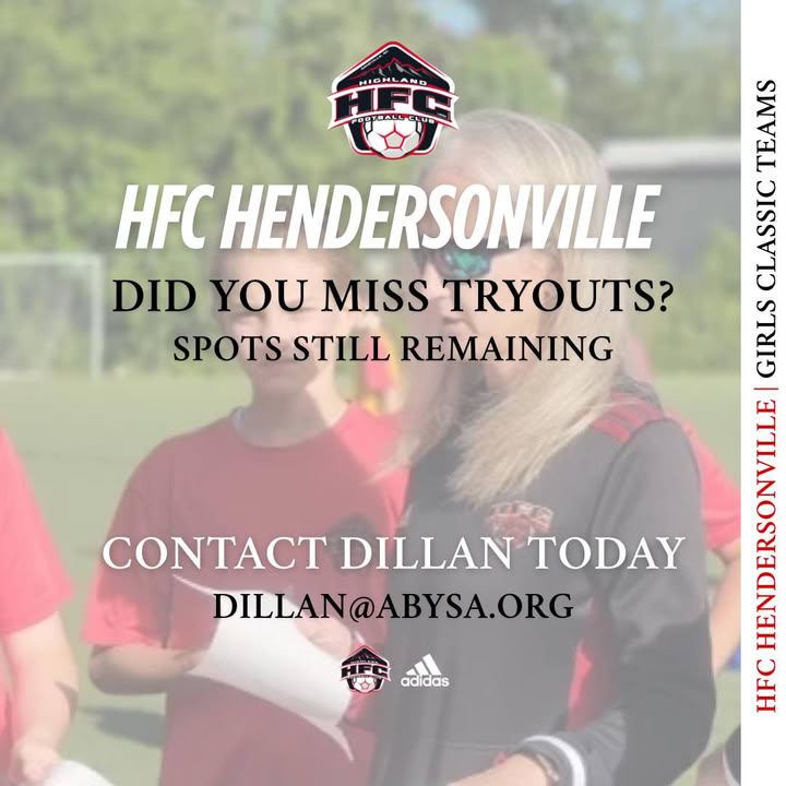 💭 HFC Hendersonville Girls Thinking of playing competitive soccer in HVL but missed tryouts? Don’t worry! We have some spots still remaining! 📧 Contact our Hendersonville director today dillan@abysa.org (fb)
