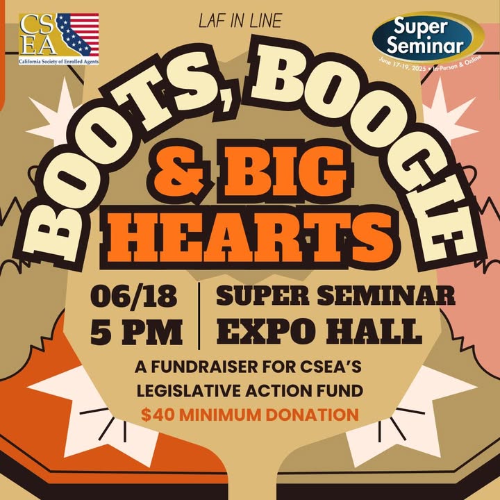 🤠REGISTRATION IS NOW OPEN!🤠 We're getting into the rodeo spirit at this year's Super Seminar. CSEA's Legislative Action Fund (LAF) fundraiser will be a Boots, Bookie & Big Hearts event. June 18th | 5 PM | Expo Hall https://www.csea.org/CSEA/Thrive/Learning_Hub/Live_Education.aspx Saddle up, dust off your cowboy boots and hats, and come ready to boogie to toe-tapping tunes, all while making a difference. This fundraiser will get those boots movin’ to get those funds raisin’! There will be a costume contest, cash bar, and more! A minimum donation of $40 per person to the Legislative Action Fund (LAF) is required for entrance and each person who donates will win a cowboy hat, bandana or a free drink! (fb)
