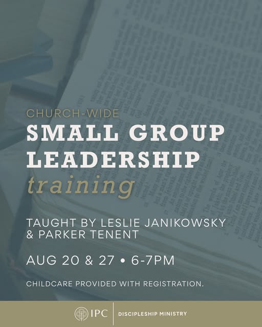 Join us for two evenings of practical training as we prepare to lead Bible studies this fall. Together, we’ll think through how God’s grace transforms lives through his Word and the relationships built in small groups. The training will be led by Parker Tenent and Leslie Janikowsky. Childcare is available with registration at ipcmemphis.org. Church-wide Small Group Leader Training Wednesdays, August 20 & 27 • 6:00-7:00 p.m. • Fellowship Hall (fb)