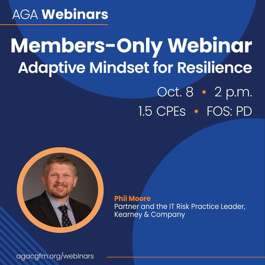 Feeling stuck in negative thinking at work? Discover how to rewire your mindset and cultivate resilience in our members-only webinar, Adaptive Mindset for Resilience. Phil Moore, Partner and the IT Risk Practice Leader at Kearney & Company will teach practical strategies to recognize and overcome your Negativity Bias. 📅 Oct. 8 • 2 p.m. ET Register today! https://zurl.co/aRKco Not a member yet? Join AGA today and unlock members-only learning opportunities! https://zurl.co/91Iye (fb)