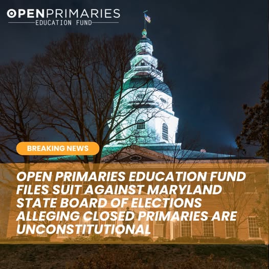 “The Open Primaries Education Fund, in partnership with Davis, Agnor, Rapaport & Skalny, LLC, one of Maryland’s leading law firms, filed a lawsuit in Maryland this week on behalf of five plaintiffs across the state against the Maryland State Board of Elections, challenging the State’s closed primary elections as unconstitutional. The case is making waves, not only Maryland but the rest of the country with over a dozen publications carrying the story, including features in the Washington Post and The Baltimore Sun. The Complaint, filed in the Circuit Court for Anne Arundel County, alleges that the MDSBE is denying Maryland citizens their fundamental right to vote, and seeks to stop the State from funding “closed” primary elections in violation of the Maryland Constitution.” Learn more about Open Primaries is doing at https://openprimarieseducationfund.org/litigating-equal-voting-rights/ (fb)