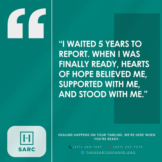 When you’re ready, we’re here. ☎️ SARC legal services available during office hours at (337) 269-1557. Need help outside office hours? Call our 24/7 SARC Crisis Line at (337) 233-7273. | www.theheartsofhope.org Like or share to uplift delayed disclosures! (fb)