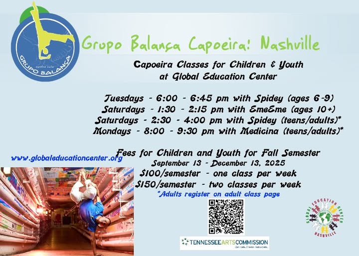 Sign-ups Open Now! Discover the Rhythm & Power of Capoeira Capoeira is more than a martial art — it’s a celebration of resilience, culture, and creativity. In every class, students learn powerful kicks, playful games, lively music, and even Portuguese language and songs. It’s a one-of-a-kind way for kids to build strength, focus, and cultural pride while having fun! 📅 Classes start September 13, 2025 👦🏾 Ages: 4–12, Teens & Adults welcome 📍 Location: Global Education Center, 4822 Charlotte Ave, Nashville, TN 💰 Fees: $100/semester for 1 class, $150/semester for 2, $200/semester unlimited 👉🏾 Register today at GlobalEducationCenter.org #GlobalEducationCenter #Capoeira #ClassSpotlight #NashvilleFamilies (fb)