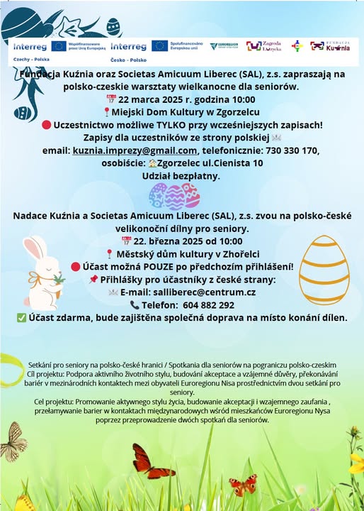 🌷🐣 Polsko-české velikonoční dílny pro seniory! 🌷🐣 📢 Nadace Kuźnia a Societas Amicuum Liberec (SAL) zvou všechny seniory na jedinečné polsko-české velikonoční dílny! To je skvělá příležitost kreativně strávit čas, poznat velikonoční tradice sousedů a budovat přeshraniční přátelství. 📅 Kdy? 22. března 2025 v 10:00�📍 Kde? Městský dům kultury v Zhořelci ✨ Co vás čeká?�🐥 Kreativní velikonoční dílny 🎨�🐥 Společná integrace a rozhovory ☕�🐥 Mezinárodní atmosféra 🇨🇿🤝🇵🇱 Těšíme se na další společné prožité zážitky! (fb)
