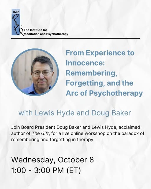 What role does forgetting play in transformation? “People come for treatment because they are remembering in a way that does not free them to forget.” – Adam Phillips “To study the self is to forget the self… and become one with the 10,000 things.” – Zen master Dogen In psychotherapy – and in life - too much self-knowledge can trap us. Clients often become experts in their own pain. But what if healing requires something else entirely? Join acclaimed author Lewis Hyde (praised by Margaret Atwood for The Gift)—for a live online workshop exploring the paradox of remembering and forgetting in therapeutic work. Drawing from his latest book, A Primer for Forgetting, Hyde invites us into a playful, searching conversation about identity, loss, and liberation. He’ll be joined by IMP Board President Doug Baker for this unique dialogue at the intersection of psychotherapy, literature, and contemplative practice. Wednesday, October 8 1–3 PM (ET) Live Online (no recording) $35 Nonmembers | $25 Members “Changes of identity call for large doses of forgetfulness.” — Lewis Hyde Spots are limited. Click website link in bio to register. (fb)