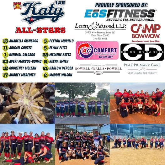 Katy All-Stars - 14U — BUILT DIFFERENT. 💥 This season, our 14U All Stars proved they’ve got heart, hustle, and serious game. 🥎🔥 From dominating on the field to lifting each other up off of it, this team played with grit, leadership, and passion. 🙌 A heartfelt THANK YOU to our incredible sponsors, the families who kept us going, and the friends who cheered from the stands (and the parking lot)! Your support was the fuel behind every inning. 💙 This team raised the bar — and they’re just getting started. Thank to our sponsors for all their support! www.ktxlawfirm.com Peak Primary Care - Katy chirodynamics Levin & Atwood, L.L.P. ac.comfort camp_bow_wow_katy EōS Fitness Proud is an understatement. The future is bright. #KGSAAllStars #14UStrong #GameChangers #SoftballSisters #ThankYouSponsors #NextLevelBall (fb)