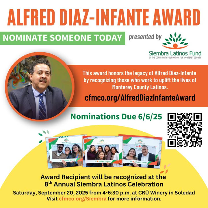 📢📢 REMINDER: Know someone who is working to uplift the Latino community in Monterey County? Nominate them for the Alfred Diaz-Infante Award by June 6, 2025. cfmco.org/AlfredDiazInfanteAward The prestigious award will be presented at the 8th Annual Siembra Latinos Celebration on Saturday, September 20, 2025 at CRŪ Winery in Soledad. (fb)