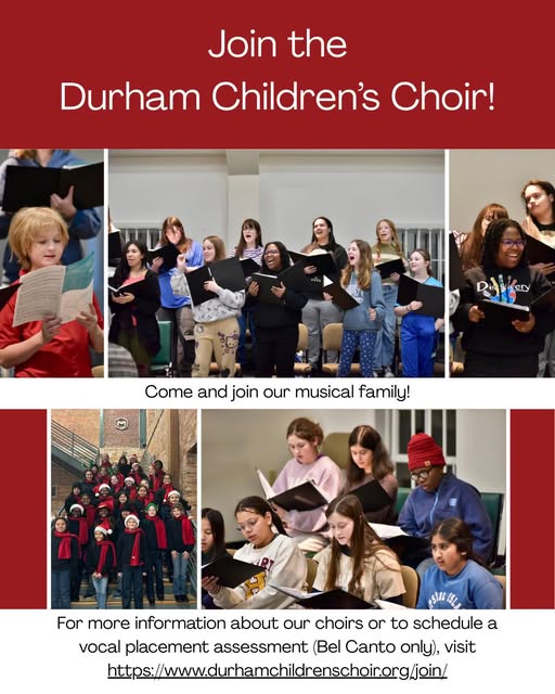 Come and join our musical “family!” Auditions happening next week for Bel Canto (5th-12th grades). Open Enrollment for all other choirs. Visit www.durhamchildrenschoir.org/join for more details! (fb)