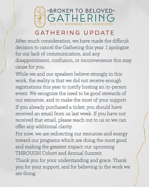 After much consideration and discussion, we’ve made the difficult decision to cancel the Gathering this year. I apologize for our lack of communication as we came to this decision, and any disappointment, confusion, or inconvenience. The reality is that we did not receive enough registrations this year to justify hosting an in-person event. We recognize the need to be good stewards of our resources, and to make the most of your support. If you already purchased a ticket, you should have received an email from us last week. If you have not received that email, please reach out to us so we can offer any additional clarity. For now, we are redirecting our resources and energy toward our programs which are doing the most good and making the greatest impact: our upcoming THROUGH Cohort and Annual Summit. I apologize again for any inconvenience this may have caused, and sincerely appreciate your understanding and grace. Thank you again for your support, and for believing in the work we are doing. #broken #beloved #brokentobeloved #spiritualabuse #religioustrauma #hope #healing #wholeness #trauma #churchhurt #churchharm #community #spiritualabuseawareness #deconstruction (fb)