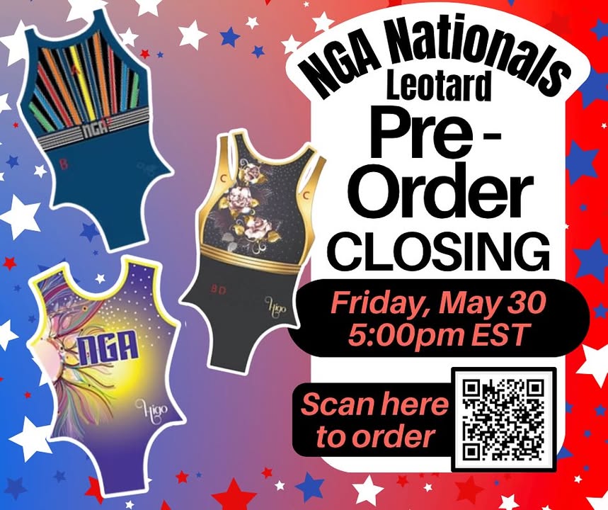 ATTENTION PARENTS & GYMNASTS! 2025 NGA National Championship Leotard Pre Orders will CLOSE Friday, May 30 at 5:00pmEST to allow the HIGO Staff to travel to Virginia Beach! Please place your orders NOW by scanning the QR Code above! (fb)