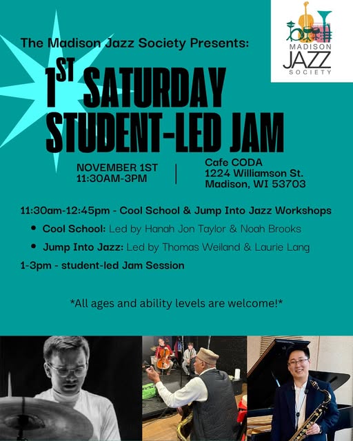 Some moments from our October programming! We are grateful for the incredible artists, collaborators, and donors who make these events possible. 10/4 - Jump Into Jazz and Cool School at @cafecodamadison 10/8 - Jazz Jam & Workshops at @copamadison (fb)