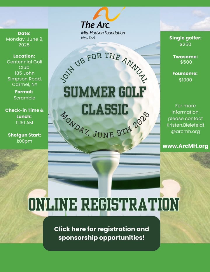 🏌️♂️ Tee Off for a Cause in Carmel! 🏌️♀️ Join us for The Arc Mid-Hudson’s Summer Golf Classic at the beautiful Centennial Golf Club in Carmel, NY! 📅Monday, June 9 ⛳ Enjoy a day of golf, great food, raffles, and camaraderie—all while supporting individuals with intellectual and developmental disabilities in our community. 💚 All proceeds go directly to programs that empower and uplift people served by The Arc Mid-Hudson. Whether you’re a seasoned golfer or just in it for the fun, this event is not to be missed! 🔗 For sponsorship opportunities and registration: https://bit.ly/4juNvJl #CarmelNY #HudsonValleyGolf #ArcMidHudson #GolfForGood #CommunityMatters #SummerGolfClassic (fb)