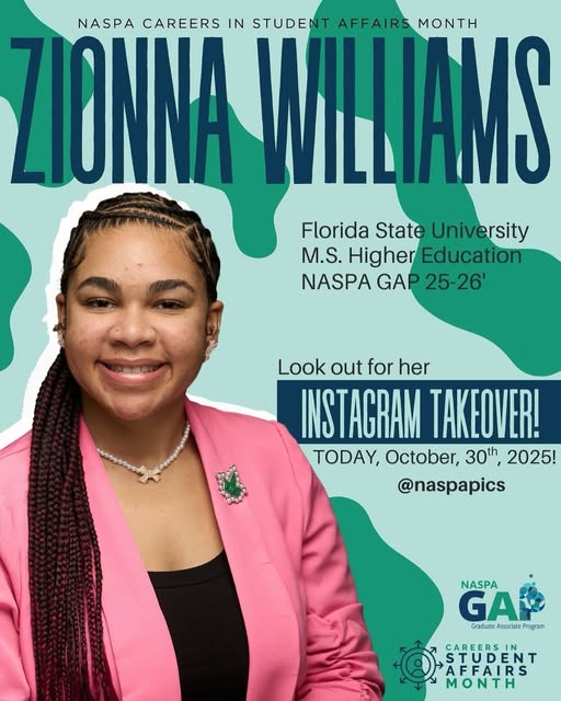 Join Zionna today as she takes over the Instagram stories! 🤳🏽🤩 Zionna is currently in her first year of the Higher Education master’s program (@fsu_hesa) at Florida State University and serves as a Graduate Assistant with University Housing. Have any questions for Zionna? Stay tuned to our stories and ask away! 😊 #CareersInStudentAffairsMonth #NASPA #HigherEd #StudentAffairs (fb)