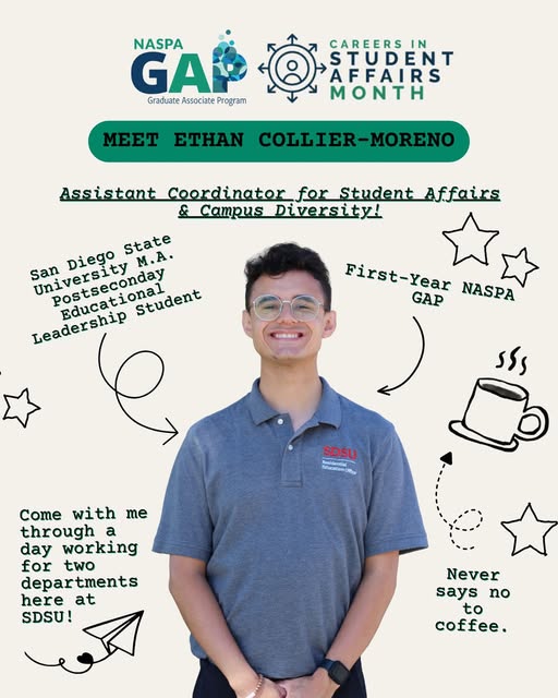 Howdy from Sunny San Diego, California and San Diego State University! ☀️ My name is Ethan Collier-Moreno (he/him/él), and come join me on a day working for SDSU’s Residential Education Office and Pierce Greek Life Center (@greeklifesdsu)! As we wrap up Careers in Student Affairs Month, I’m super excited to showcase a day in my life working and attending SDSU as a graduate student! We got a jam-packed day ahead and it’s SDSU’s Homecoming and Halloween! Excited to have you follow along 💙💚 (fb)