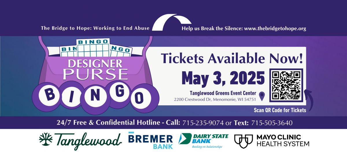 Home Services Contact Us Employment Donate About Surveys More 24 Hour Hotline CALL 18009249918 or 7152359074 TEXT 7155053640 Upcoming Events Our 5th annual Designer Purse Bingo Fundraiser will take place on May 32025. This event will be held at Tanglewood Greens in Menomonie WI. Tickets are on sale now. You can purchase them by scanning the QR code or using this linkhttpswww.