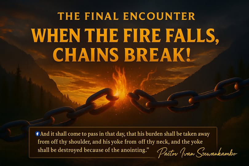 🔥 Season Series | Restoring Relationships 🔥 The Final Encounter: “When the Fire Falls, Chains Break!” Family, this isn’t just the end of a sermon series—it’s the climax of what the Holy Spirit has been doing among us. For weeks, God has been restoring what was broken. But in this Final Encounter, He is not only healing—He is releasing His fire to activate destinies! 📖 “And it shall come to pass in that day, that his burden shall be taken away from off thy shoulder, and his yoke from off thy neck, and the yoke shall be destroyed because of the anointing.” — Isaiah 10:27 (KJV) 🔥 When the fire falls, every yoke is destroyed. 🔥 When the fire falls, chains snap open. 🔥 When the fire falls, callings awaken. 🔥 When the fire falls, families are reconciled. This is not just celebration—it’s prophetic warfare! Like Jericho, walls will crumble when your praise goes up. Like Paul and Silas, prison doors will fly open when you lift up your midnight worship. This Final Encounter is not about where you have been—it’s about where God is sending you next. Step into the fire, and watch Him break every chain! — Pastor Ivan Ssewankambo #HolyGhostFire #deliverance #thefinalencounter #restoringrelationships #CelebrationAndActivation #pastorivanssewankambo @followers @top fans (fb)