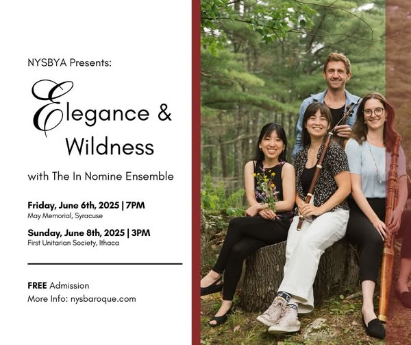 It's our last, but certainly not the least, concert of the season! NYSB is thrilled to present up-and-coming talent in the early music world through our Young Artist Series. Our next Young Artist Ensemble for the 2024-2025 season is the New York City-based In Nomine Ensemble, who will present their program called Elegance and Wildness. This program explores the musical intersections where Georg Philipp Telemann’s works engage with the refined elegance of French Baroque style and the spirited, untamed energy of Gypsy music. The program reflects Telemann’s time in Paris and his exposure to the French Baroque tradition, influenced by his interactions with French composers while maintaining his distinctive voice. Following the Nouveaux quatuors, selected pieces from the Uhrovska Collection (1730) will be heard, alongside his Trio Sonata in D minor, which reveals his fascination with Eastern European folk traditions. This is a FREE concert, so invite your favorite music-lovers to come and enjoy some Baroque this Friday in Syracuse, and Sunday in Ithaca! EVENT INFO: NYSB Young Artists Presents: In Nomine Ensemble (fb)