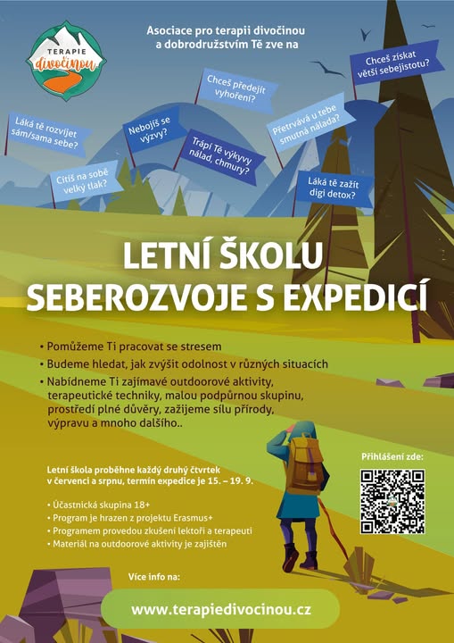 Právě nyní probíhá přihlašování na LETNÍ ŠKOLU SEBEROZVOJE S EXPEDICÍ. Je to skvělá možnost, jak porozumět více sám sobě, v bezpečném prostředí malé skupiny, se zkušenými lektory, skrze přírodu, výzvu..není to "hurá akce", ale proces, který rozvíjí.. Navíc je celá akce hrazena Těšíme se na tebe! Přihlašování zde: https://docs.google.com/forms/d/e/1FAIpQLSd6R2DmPwzxlphAkPGjUHRqWHNkhOY38wIdt9zT__IV_oxJjA/viewform?usp=header Více o akci: https://terapiedivocinou.cz/letni-skola-seberozvoje-s-expedici/ (fb)