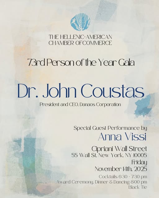 The Hellenic-American Chamber of Commerce - 73rd Person of the Year honoring Dr. John Coustas, Friday, November 14th, 2025 | Special Guest Performance by Anna Vissi at Cipriani Wall Street - https://mailchi.mp/hellenicamerican.cc/the-hellenic-american-chamber-of-commerce-73rd-person-of-the-year-honoring-dr-john-coustas (fb)
