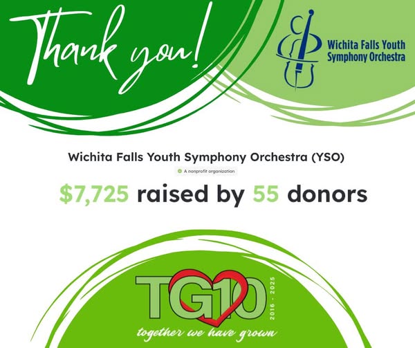 A huge thank you to the 55 incredible donors who made all of this possible! But that’s just the beginning. We also want to give a big shoutout to our board, students, coaches, director, conductor, parents, and of course, YOU, our amazing audience. We couldn’t do it without each and every one of you! Thank you to Texoma Gives for making this possible and to get us closer to our goal we can empower our artistic youth through music! #youth #music #texomagives #wfyso #wichitafalls #gratitude #community #teamwork (fb)