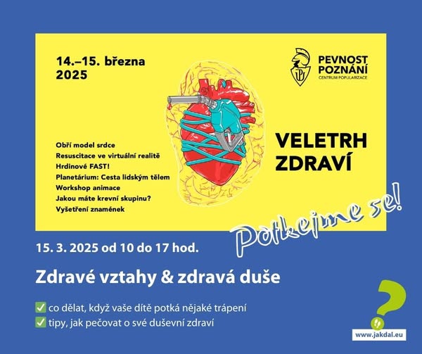 Jak Dál? na Veletrhu zdraví – pečujeme o duševní zdraví Zdraví není jen o těle, ale i o duši! 💙 V sobotu 15. března se s Jak Dál? setkáte na Veletrhu zdraví v Pevnost poznání Olomouc. Od 10 do 17 hodin vám na našem stanovišti "Zdravé vztahy & zdravá duše" rádi poradíme, jak pečovat o své duševní zdraví nebo co dělat, když vaše dítě prochází náročným obdobím. Pro děti jsme připravili terapeutické komiksové omalovánky, pro všechny bez rozdílu věku pak pískoviště Sandplay – jedinečnou prožitkovou metodu, která otevírá bránu ke kreativitě a sebepoznání. Víte, že téma duševního (ne)zdraví je v české společnosti stále trochu tabu? My v Jak Dál? pomáháme tyto ledy prolomit a provázíme složitými situacemi děti, dospívající, mladé dospělé i celé rodiny. Přijďte si popovídat a načerpat inspiraci pro zdravou mysl! 📍 Pevnost poznání, Olomouc 📅 Sobota 15. března 2025 ⏰ 10:00–17:00 #JakDal #DusevniZdravi #VeletrhZdravi #TydenMozku (fb)