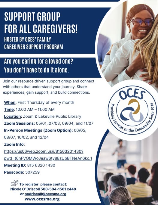 You're Not Alone: Caregiver Support Group Caring for a loved one can be rewarding, but it can also be overwhelming and isolating. Join our caregiver support group to connect with others who understand what you're going through. Space still available for the August 7th session. Call 508-584-1561 ext. 448 to learn more. (fb)