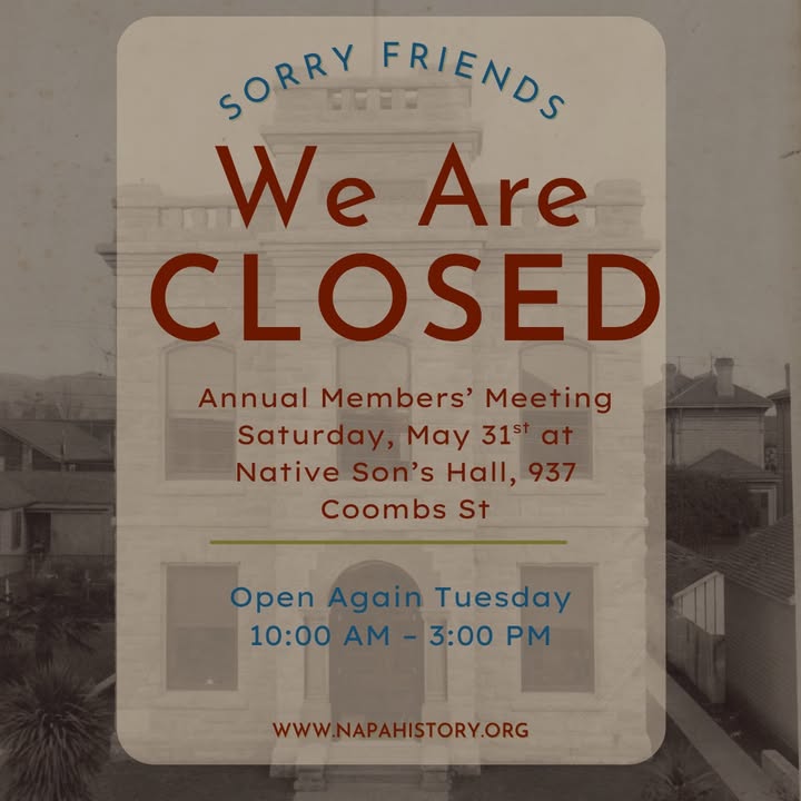 The Napa County Historical Society will be closed on Friday, May 31 for our annual members' meeting. We’ll reopen and welcome you back on Tuesday, June 4. Thank you for your understanding. (fb)