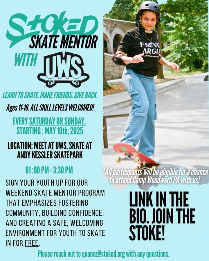 Ready to roll? 🛹 Join the Stoked Skate Mentor Program with @upperwestskates ! Learn to skate, make friends, and give back—open to ages 11-18, all skill levels welcome! Sessions run every Saturday or Sunday starting May 10th, 2025, 1:00–3:30 PM. Meet at UWS, skate at Andy Kessler Skatepark. Build confidence, connect with your community, and skate in a safe, welcoming space—for FREE! Plus, all participants are eligible for a chance to attend Camp Woodward PA with us! Sign up now—link in bio. Join the stoke! (fb)