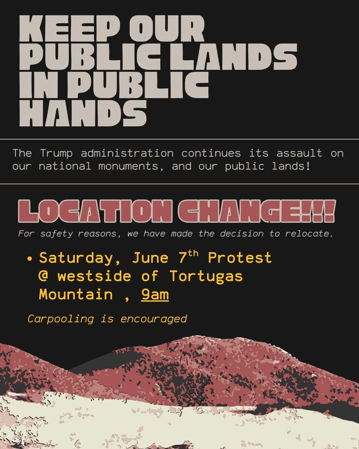 🚨 LOCATION CHANGE for the OMDP event! June 7th is Defend National Monuments & Public Lands Day of Action: Our protected landscapes (including OMDP) were designated after years of organized effort from Tribal nations and indigenous advocates, outdoor recreationists, business owners, artists, faith leaders, and environmental groups. The Trump administration is undermining decades of efforts and our voices for the benefit of big corporations! For safety reasons, Friends of the Organ Mountains-Desert Peaks has made the decision to relocate. We will be meeting at the west side parking lot at Tortugas Mountain/A-Mountain! Carpooling is still encouraged as there is limited parking! Pledge your participation on June 7th here: https://www.nmwild.org/event/june-7th-day-of-action-rally-for-your-public-lands/ (fb)