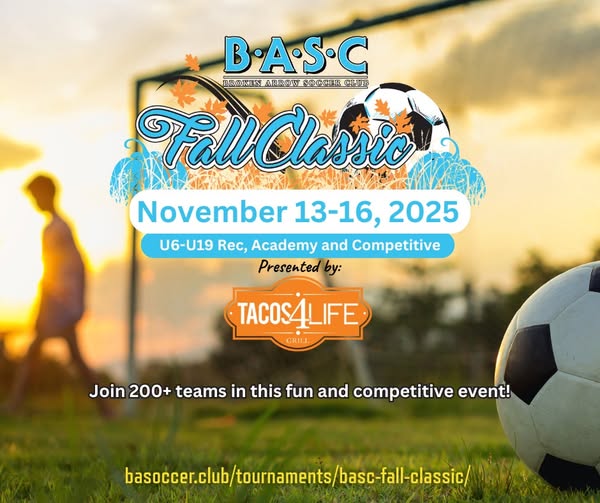 ⚽🍂 Don’t miss out! The Early Registration Deadline for the BASC Fall Classic presented by Tacos 4 Life - Broken Arrow is 𝑶𝒄𝒕𝒐𝒃𝒆𝒓 5𝒕𝒉. Lock in your discounted rate today and join us November 13–16 for one of the region’s favorite tournaments! Register now: https://basoccer.club/tournaments/basc-fall-classic/ (fb)