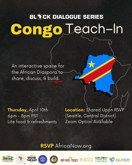 The Black Dialogue Series brings together young adults from across the African Diaspora to share, discuss, and build. This teach-in will dive into the crisis in Eastern Congo. This conflict is deeply rooted and did not just recently start, but since the latest insurgence of Rwanda-backed M23 rebels in January '25 over 7,000 Congolese people have been murdered. Thousands more have been injured and displaced. Come learn more, discuss solutions, and connect with other changemakers! Time: 6pm - 8pm PST Location: In-Person & Online For security reasons, the location and Zoom link will be shared upon RSVP. The event will be held in Seattle's Central District for those who plan to join us in person. (fb)