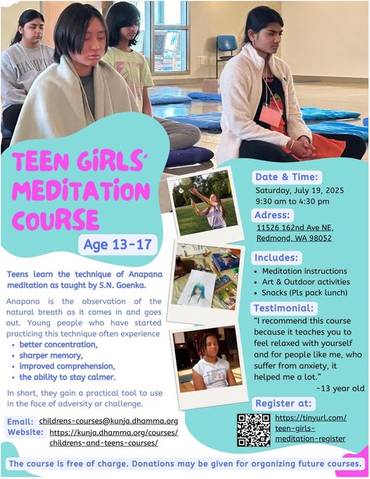 📣 Northwest Vipassana Center is organizing a 1-day Anapana meditation course for teen girls, ages 13-17. ✨🧘♀️ ⏳ Date & Time: Sat, July 19, 2025 from 9:30 am to 4:30 pm 📍Address: https://maps.app.goo.gl/nzLWjwNs1BaFnwyVA?g_st=com.google.maps.preview.copy 📝 Register at: https://www.dhamma.org/en-US/portal/student_apps/new_app?course_id=183524&location_id=1540 🌍 Website: https://kunja.dhamma.org/courses/childrens-and-teens-courses/ 📩 Email: childrens-courses@kunja.dhamma.org (fb)
