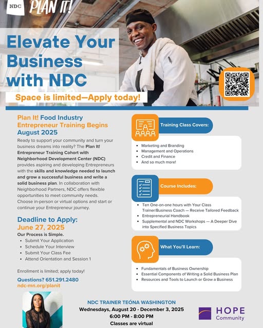 Hope is once again partnering with our friends at NDC to offer a Plan It! entrepreneur training series! This series will focus on building businesses in the food industry and classes will meet online Wednesday evenings this fall. Deadline to apply is June 27. Space is limited! Questions? Call Malyun at 612-435-1678. Neighborhood Development Center @ndc_minnesota (fb)