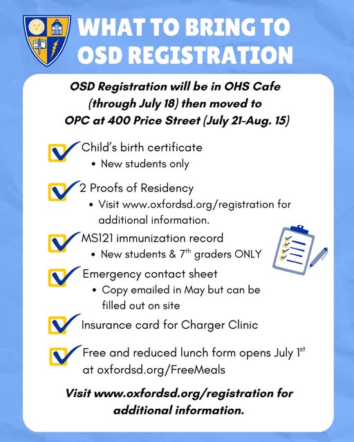 Registration document drop off starts TOMORROW in the OHS Cafeteria. Make sure you have all of your required documents!⚡️ Visit www.oxfordsd.org/registration for additional information. (fb)