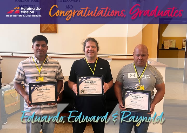 Please join us in congratulating Eduardo, Edward and Raynold, Helping Up Mission’s newest graduates from our Spiritual Recovery Program! Through hard work, perseverance and faith, these men have completed a life-changing journey of healing and transformation. We are proud of their courage and excited for the bright futures ahead of them. Let’s lift them up in prayer and encouragement as they step into this next chapter! 💛 #HelpingUpMission #GraduateStrong #RecoveryJourney #FaithInAction #LifeTransformation (fb)