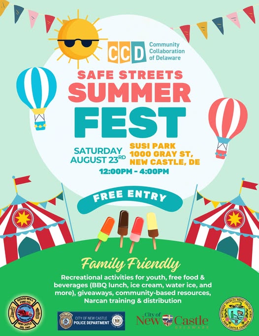 🎉 Reminder: CCD's Safe Streets Summer Fest is Tomorrow! ☀️ We’re just one day away from a fun and free community celebration at Susi Park in New Castle! Join us Saturday, August 23 from 12 PM to 4 PM for an afternoon filled with: 🌭 Free food and drinks 🎯 Games and activities for kids and teens 🎁 Exciting giveaways 🤝 Local organizations and community resources ✅ Narcan training and distribution Friendly reminder: Food and beverages will be available on a first-come, first-served basis, while supplies last. 🍔🥤 📍 Susi Park, 1000 Gray Street, New Castle, DE 19720 🕛 12 PM to 4 PM 🎟️ Free entry for all ages Come early, enjoy the fun, and make the most of this family-friendly event! We can’t wait to see you there! 💙 #SafeStreets #SummerFest #CommunityCelebration #NewCastleDE #FamilyFun #FreeEvent #NarcanAwareness #TogetherWeThrive #CCDCares (fb)