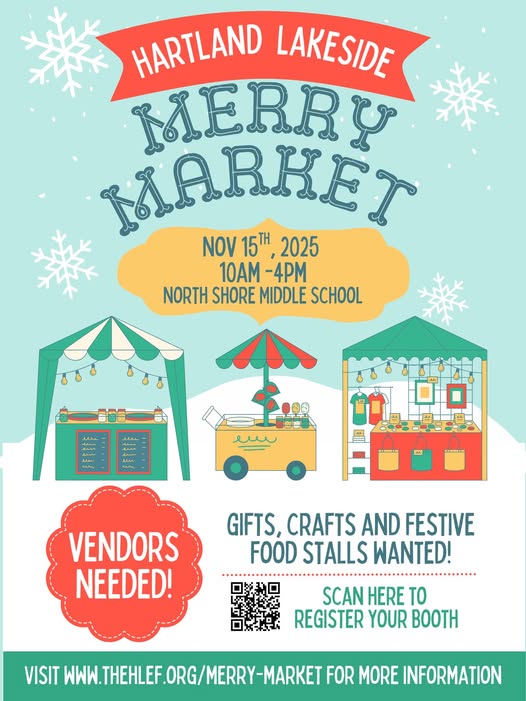 🎄✨ Calling All Local Makers & Small Businesses! ✨🎄 The Hartland-Lakeside Education Foundation is now accepting vendor applications for our Merry Market—a festive, family-friendly holiday shopping event coming this season! 🛍️🎁 Are you a crafter, baker, artist, or small shop owner? Don’t miss your chance to showcase your goods to our vibrant community while supporting local schools! 📅 Date: November 15th, 2025 📍 Location: North Shore Middle School 💌 Apply now or tag a vendor friend below: https://www.zeffy.com/en-US/ticketing/craft-fair-2 #HartlandWI #HolidayMarket #SupportLocal #MerryMarket #HLEF #ShopSmall (fb)