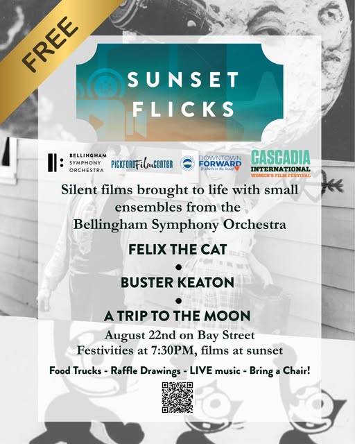 The BSO and Pickford Film Center are closing down Bay Street on Friday, August 22nd for a FREE family-friendly event! Join us as we celebrate film, live music, and our fantastic downtown arts district. We'll also be holding a free raffle giving away 50 season subscriptions and two Yo-Yo Ma tickets! (Must be in attendance to win Yo-Yo Ma tickets.) We're grateful to the City of Bellingham and Cascadia International Women's Film Festival for the support! Learn more here: https://www.bellinghamsymphony.org/event/sunset-flicks #bellinghamsymphonyorchestra #bso #pickfordfilmcenter #silentfilm #bellinghamwa #classicalmusic #livemusic #felixthecat #busterkeaton (fb)