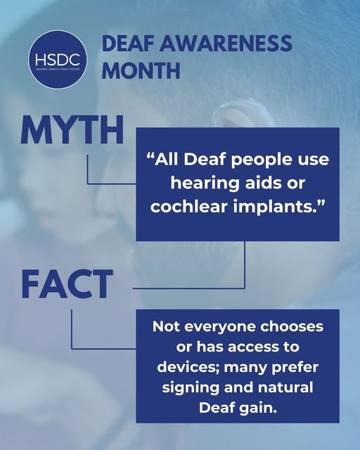 It’s #MythbusterThursday! Join us all month as we bust common myths for Deaf Awareness Month. ID: A social post with a faded photo of a Deaf man with hearing aids, interacting with a kid. Title on top with HSDC circular logo on left: Deaf Awareness Month". Texts on the post: Myth: “All Deaf people use hearing aids or cochlear implants.” Fact: Not everyone chooses or has access to devices; many prefer signing and natural Deaf gain. #DeafAwarenessMonth #HSDC (fb)