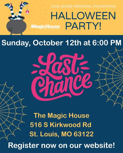 LAST CHANCE to sign up for this weekend's "Not-So-Haunted-House" Halloween party! This event is FREE and you'll get private after hours access, so don't miss your chance to explore the Magic House while Trick-or-Treating along the way! Sign up now: https://junejessee.org/halloween-party/ (fb)
