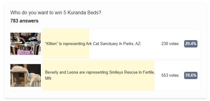 Oh no!! Smiley's Rescue is pulling ahead!! We'd really love to have those Kuranda beds for our sweet cats! If you haven't voted, please take a moment to do so; and be sure to share!! https://kuranda.com/dog-of-the-month INFO: Calling all cat lovers! 📣 We need your help to win FIVE Kuranda pet beds for our shelter cats! Our very own Ark is a contender in Kuranda's June "Cat" of the Month Contest, and the shelter with the winning cat gets an amazing donation of five Kuranda pet beds. These beds are incredibly durable and comfortable, and would make a huge difference in the lives of our rescue cats. It's super easy to vote and you don't even need an account! There are only two shelters in this month's competition, so every vote truly counts! Vote for Ark here: https://kuranda.com/dog-of-the-month Voting is open until June 15th, so please vote today and share with your friends and family! Let's get Ark those beds! 😻 #VoteForArk #CatOfTheMonth #KurandaPetBeds #ShelterCats #rescueCats #Adoption #SupportOurShelter #ArkCatSanctuary #Cats #AdoptDontShop #animalovers #HelpUsHelpThem #catcare #helpushelpthem #catrescue #rescuecatsofinstagram (fb)