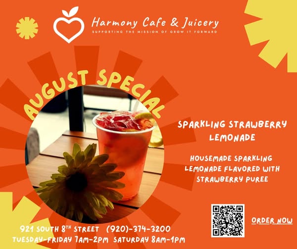 Stop by Grow It Forward - Harmony Café & Juicery and grab a refreshing Sparkling Strawberry Lemonade! It's the perfect way to reset and feel refeshed! The cafe is open Tuesdsy-Friday 7am-2pm and Saturday 8am-1pm! Remeber you can order online to place your to-go order! (fb)