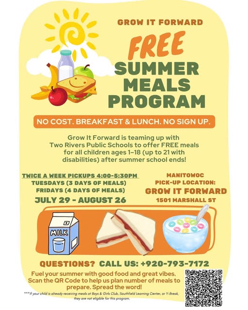 🌞 Summer Meal Pick-Up 🌞 If your family could benefit from free summer meals for your kids (ages 1-18, or up to 21 with disabilities), please join us! Meals will be available twice a week—Tuesdays & Fridays— for pick-up at either: 🍎 Grow It Forward in Manitowoc (4:00-5:30 PM) 🍎 L.B. Clarke Middle School in Two Rivers (4:00-5:30 PM) 🍎 Koenig Elementary in Two Rivers (11:00 AM-12:30 PM) To-Go Breakfast & Lunch Meals: - Tuesdays: Receive 3 days worth of meals - Fridays: Receive 4 days worth of meals. - Each pickup includes both breakfast and lunch. ➡️ Please note: If your child is already receiving summer meals at Boys & Girls Club, Southfield, or Y-Break, or another summer meal program, they are not eligible to pick up meals at these sites. ✅ Open to ALL families in Manitowoc County who are not part of another summer meal program. ✅ Home delivery is available for Two Rivers School District families without transportation only. (fb)