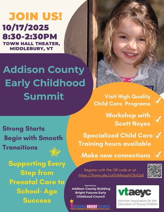 Join the Addison County Regional Council for the second annual Early Childhood Summit on Friday, October 17th, 2025 in Middlebury. This year’s theme is Transitions—Exploring pathways that support children, families, and providers through key developmental and educational milestones. Register here:https://forms.gle/JuGUhRxaq1yCKsQc8 (fb)