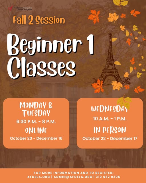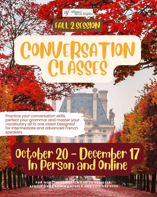 🗣️✨ Ready to boost your French fluency? Join our Fall 2 Conversation Classes at Alliance Française de Los Angeles! From October 20 to December 17, practice real-life French, expand your vocabulary, and gain confidence in speaking. 💬🍷 📅 In-person & online options available — perfect for every level! 👉 Spots are limited — sign up today and keep the conversation flowing at afdela.org! (fb)