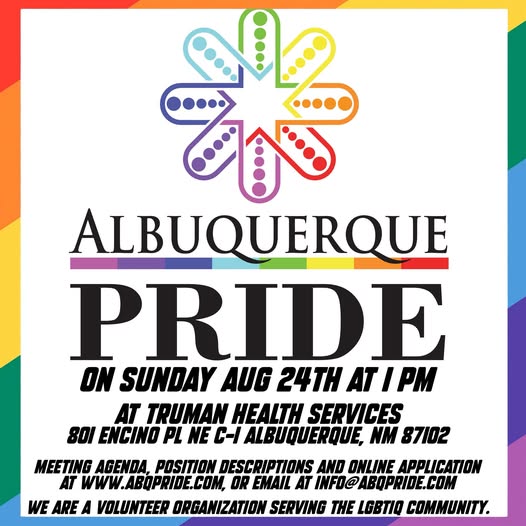 Join us Today at 1PM July 24th, 2025 for Albuquerque Prides Annual General Meeting at UNM Truman Health Services 801 Encino Place NE, Suite C-1, Albuquerque, NM 87102. What you can expect: Voting on new board positions Voting on our fiscal year budget Voting on by law changes Discussions about the year to come Community Open to the public (fb)