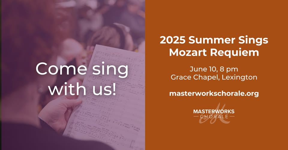 🎵🎶 Our popular Summer Sings series returns! We kick off with the beautiful Mozart Requiem on Tuesday, June 10, 8pm, at Grace Chapel, Lexington. Bring your score, or borrow one of ours. Plus, one lucky person will win two free concert tickets for our 2025-2026 season. Come sing with us! https://www.masterworkschorale.org/summer-sings?utm_source=facebook&utm_medium=organic-social&utm_campaign=2025-summer-sings (fb)