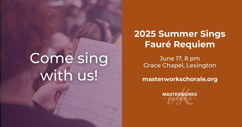 Come sing the serene Fauré Requiem with Masterworks Chorale! Join us on Tuesday, June 17, 8pm, at Grace Chapel, Lexington. Bring your score, or borrow one of ours. 🎫Two lucky participants will also win free concert tickets for the 2025-2026 season. https://www.masterworkschorale.org/summer-sings?utm_source=facebook&utm_medium=organic-social&utm_campaign=2025-summer-sings (fb)